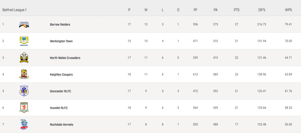 Clubs agreed prior to the season commencing to contest the Betfred Championship and League 1 on a ‘points percentage’ basis due to the threat of postponements and cancellations presented by the ongoing coronavirus pandemic. Points percentage is calculated by the number of matches won by a club, divided by the number of matches played, multiplied by 50.